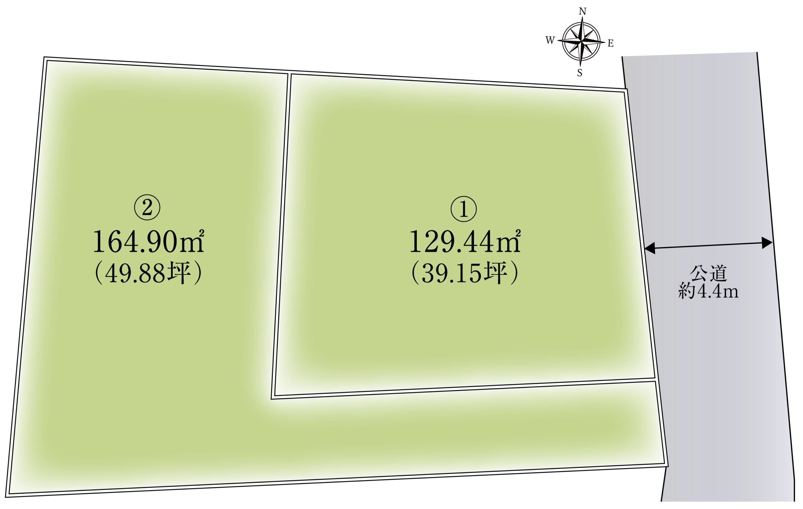土地面積 ①129.44㎡(39.15坪)・②164.90㎡(49.88坪)